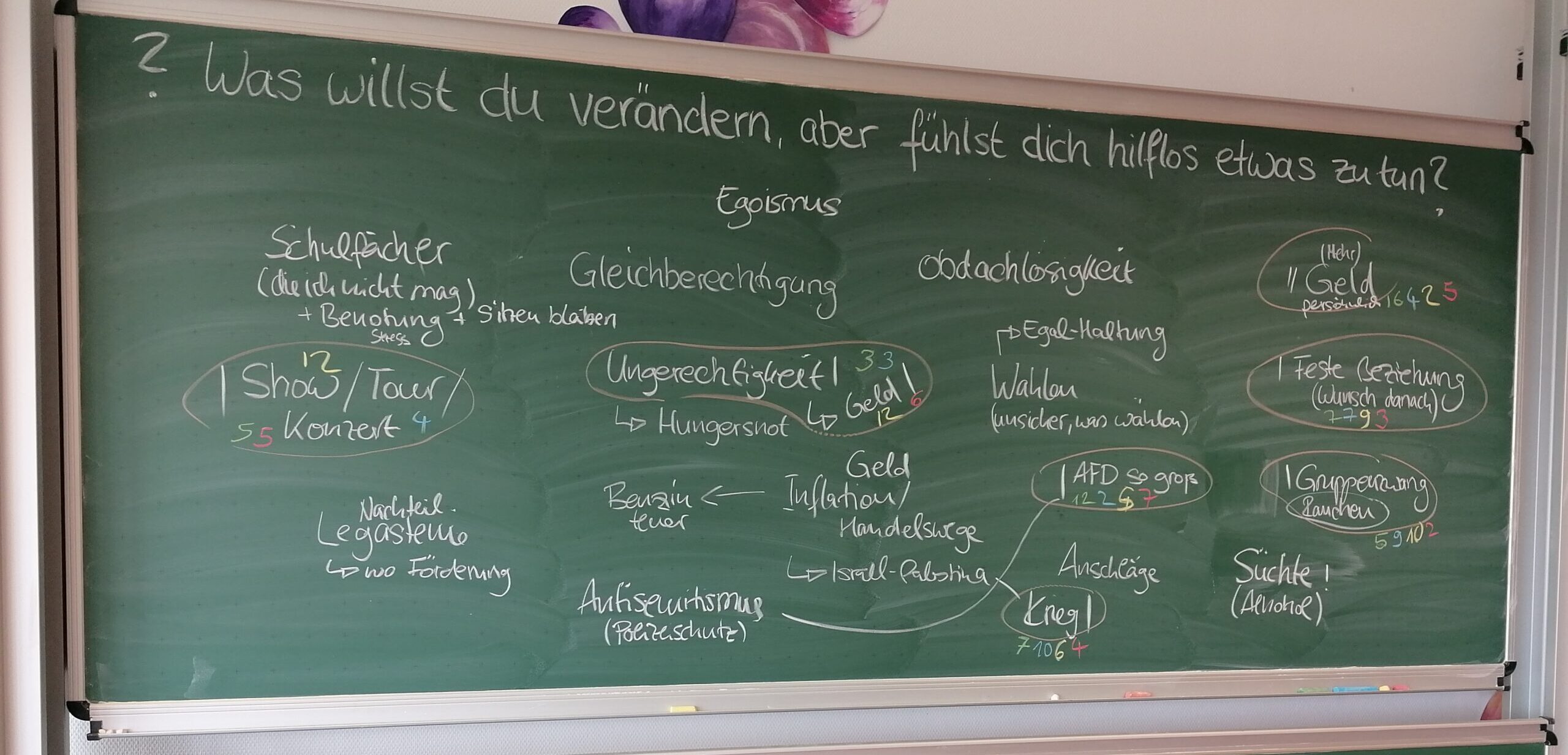 Mit zu dem eindrücklichsten und besondersten der Workshops gehört für uns, was die Schüler*innen als Antwort auf diese Frage an Themen in der ganzen Klasse vorgebracht haben. Eine eindrucksvolle Sammlung ist da entstanden.